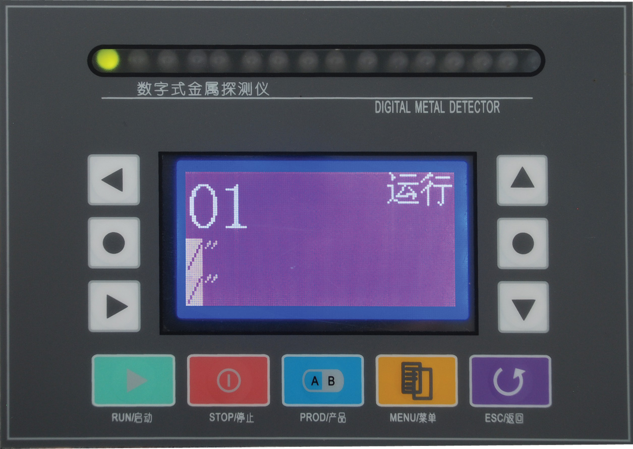 指示燈 從左起,第一個(gè)燈為運(yùn)行指示燈。正常探測(cè)時(shí),該燈為綠色。第二個(gè)燈為NG指示燈,當(dāng)探測(cè)到金屬異物時(shí),該燈為紅色。其余燈為等級(jí)顯示LED,顯示金屬成份探測(cè)等級(jí)。