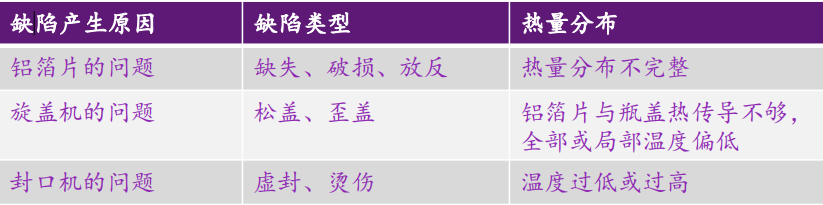 鋁箔片被電磁加熱之后,一方面融化熱封膜完成封口,另一方面通過熱傳導(dǎo)將熱量傳遞到瓶蓋,此時可以通過紅外熱成像相機捕捉到瓶蓋表面的熱量分布。此熱量分布直接反映的是墊片與瓶蓋的壓緊程度,而壓緊程度間接地反映出封口質(zhì)量。當有封口缺陷產(chǎn)生時,熱量分布會出現(xiàn)異常,其對應(yīng)關(guān)系如下: